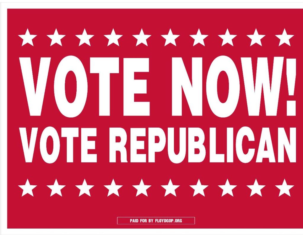 Attendance is free, but if you would like to eat, please come by 5:30 to enjoy the buffet. Please RSVP to our email newsletter. If you are not getting it, please email us at info@floydgop.org. The meal is $17. To avoid card fees, bring CASH.